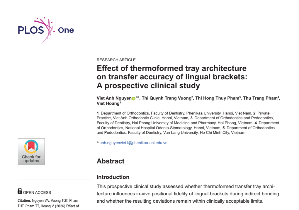 Một nghiên cứu lâm sàng tiền cứu quy mô lớn do Tiến sĩ – Bác sĩ nội trú Nguyễn Việt Anh chủ trì vừa chính thức được công bố trên PLOS ONE (Hoa Kỳ) . Công trình mang tên “Effect of thermoformed tray architecture on transfer accuracy of lingual brackets: A prospective clinical study” đánh dấu bước tiến quan trọng của chỉnh nha Việt Nam trong lĩnh vực gắn mắc cài gián tiếp kỹ thuật số (Indirect Bonding – IDB).