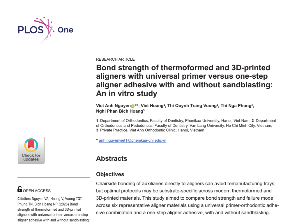 Một nghiên cứu in-vitro quy mô lớn do Tiến sĩ – Bác sĩ nội trú Nguyễn Việt Anh chủ trì vừa chính thức được công bố trên PLOS ONE (Hoa Kỳ) . Công trình mang tên “Bond strength of thermoformed and 3D-printed aligners with universal primer versus one-step aligner adhesive with and without sandblasting” đã cung cấp bằng chứng khoa học rõ ràng cho một câu hỏi rất thực tiễn trong chỉnh nha hiện đại: